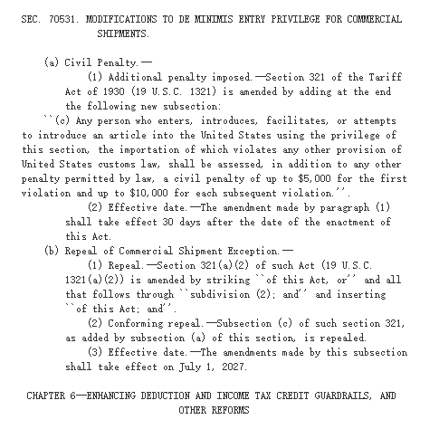 据悉,随着此次签署,不但将这项造成特朗普与马斯克矛盾的法案正式落实为美国法律一部分,同时也确定了,美国将全面取消小额豁免制度策——即价值低于800美元的进口商品可免税入境的政策。此举不仅终结了跨境电商依托 "灰色地带" 的低成本运营模式,更标志着美国贸易政策进入全面重构期。