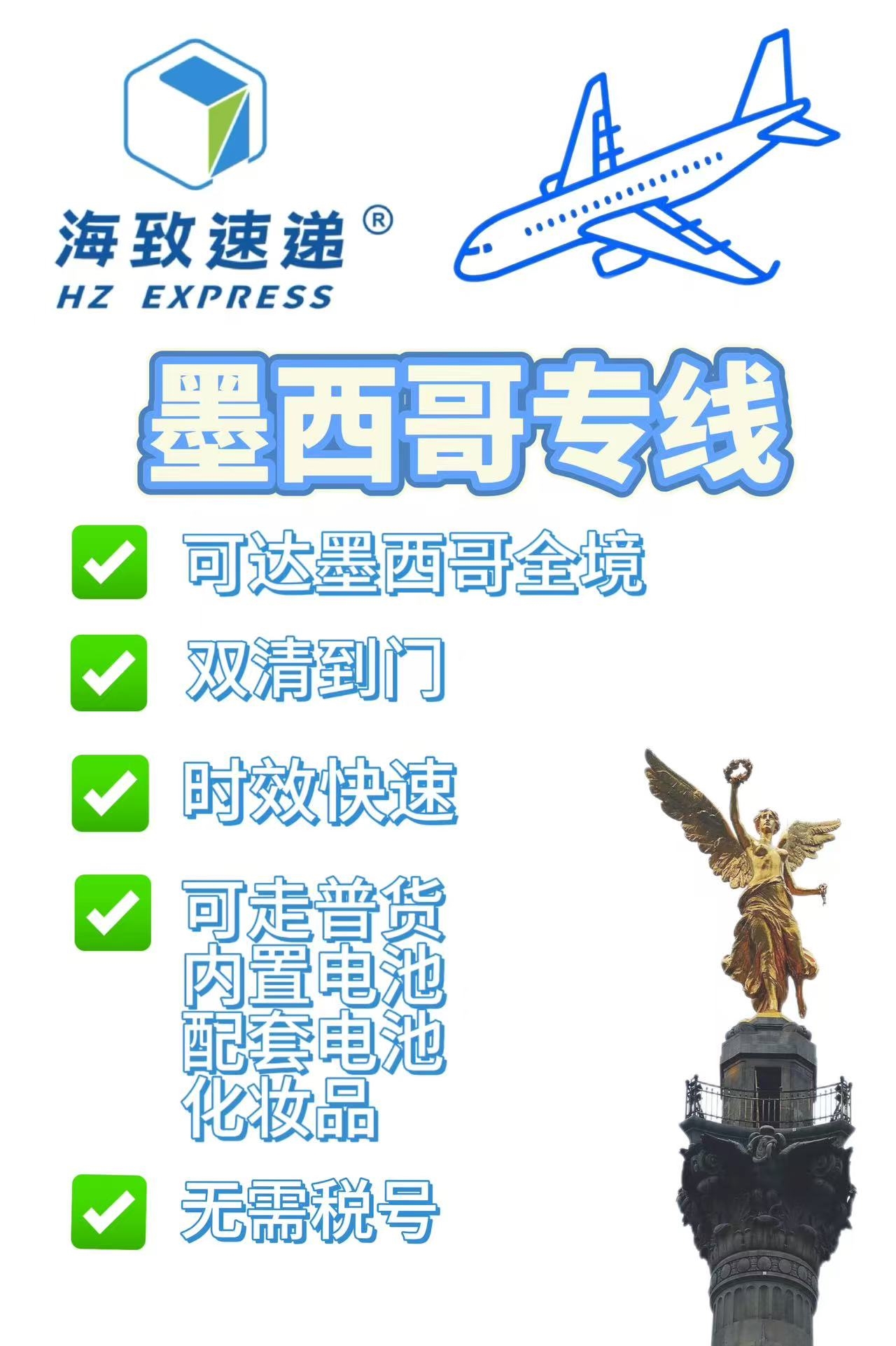 可达地址:墨西哥全境 走货属性:化妆品、内置电池、配套电池、普货 清关模式:DDP双清包税 税号(RFC):无需税号 走货重量:小于10KG 材积:除8000 服务:门到门 时效:8-12工作日